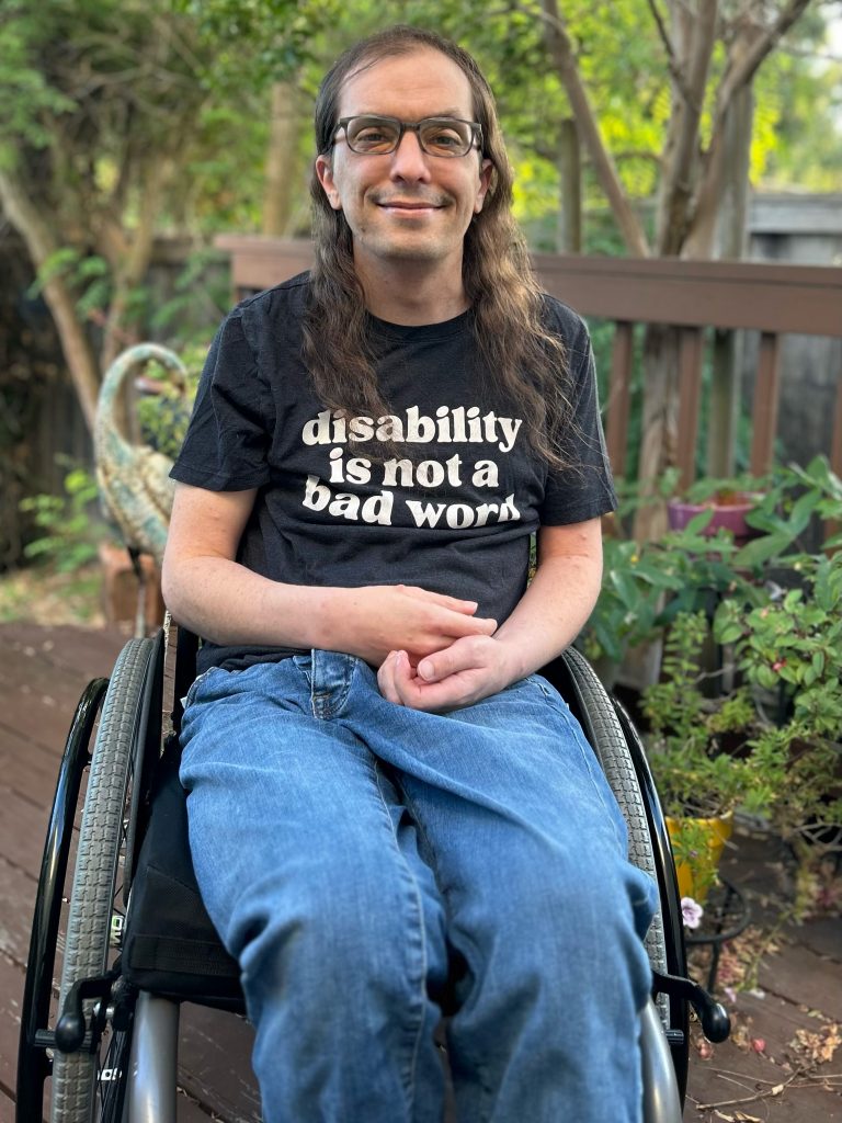 Zac is a white, 30 something year old man with long brown hair. He’s wearing grey glasses, jeans, and a dark gray shirt with white lettering that says “Disability Is Not A Bad Word”. He’s sitting in a manual wheelchair on his back deck.