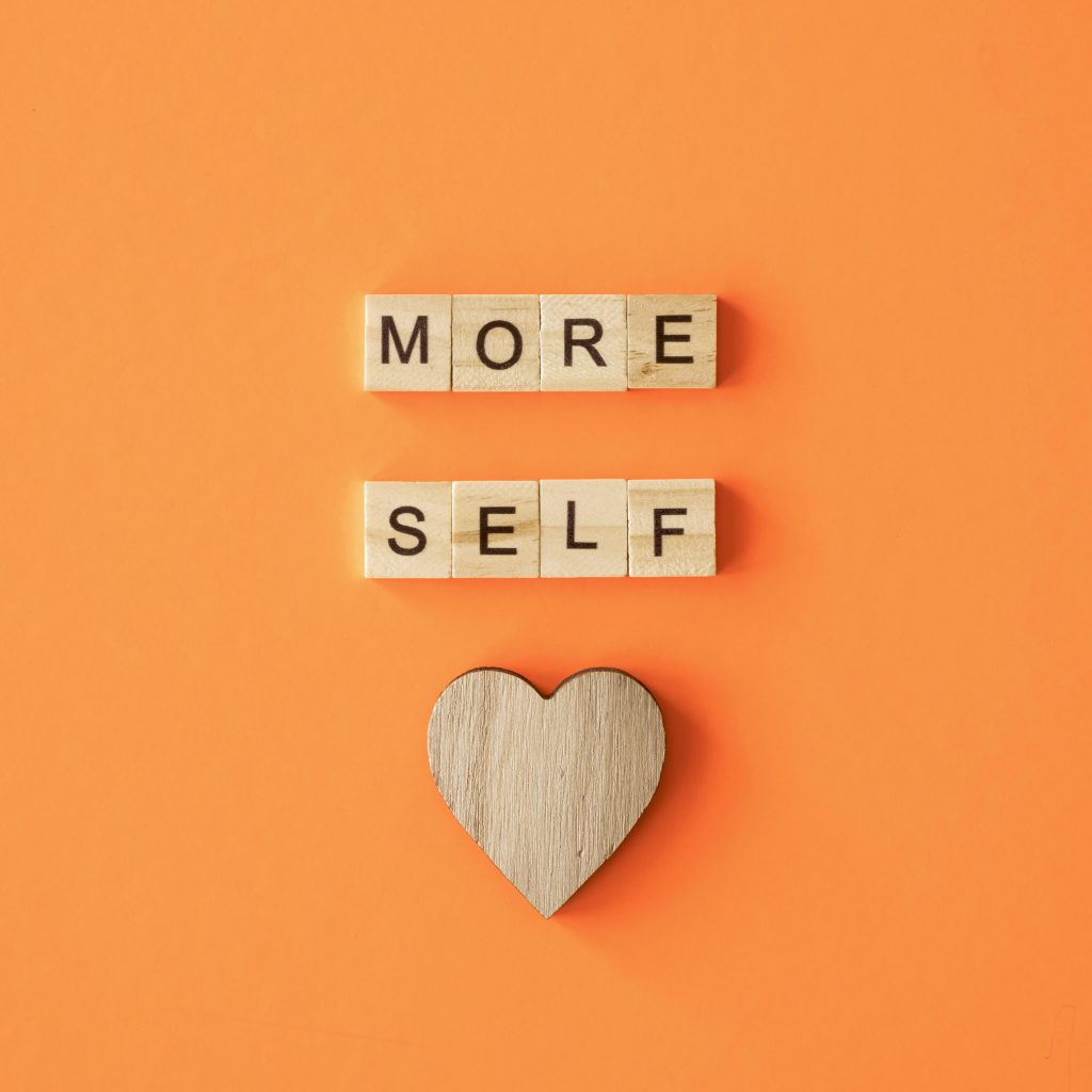 On an orange background wooden tiles spell out “More Self” and below is a heart made from a similar wood.